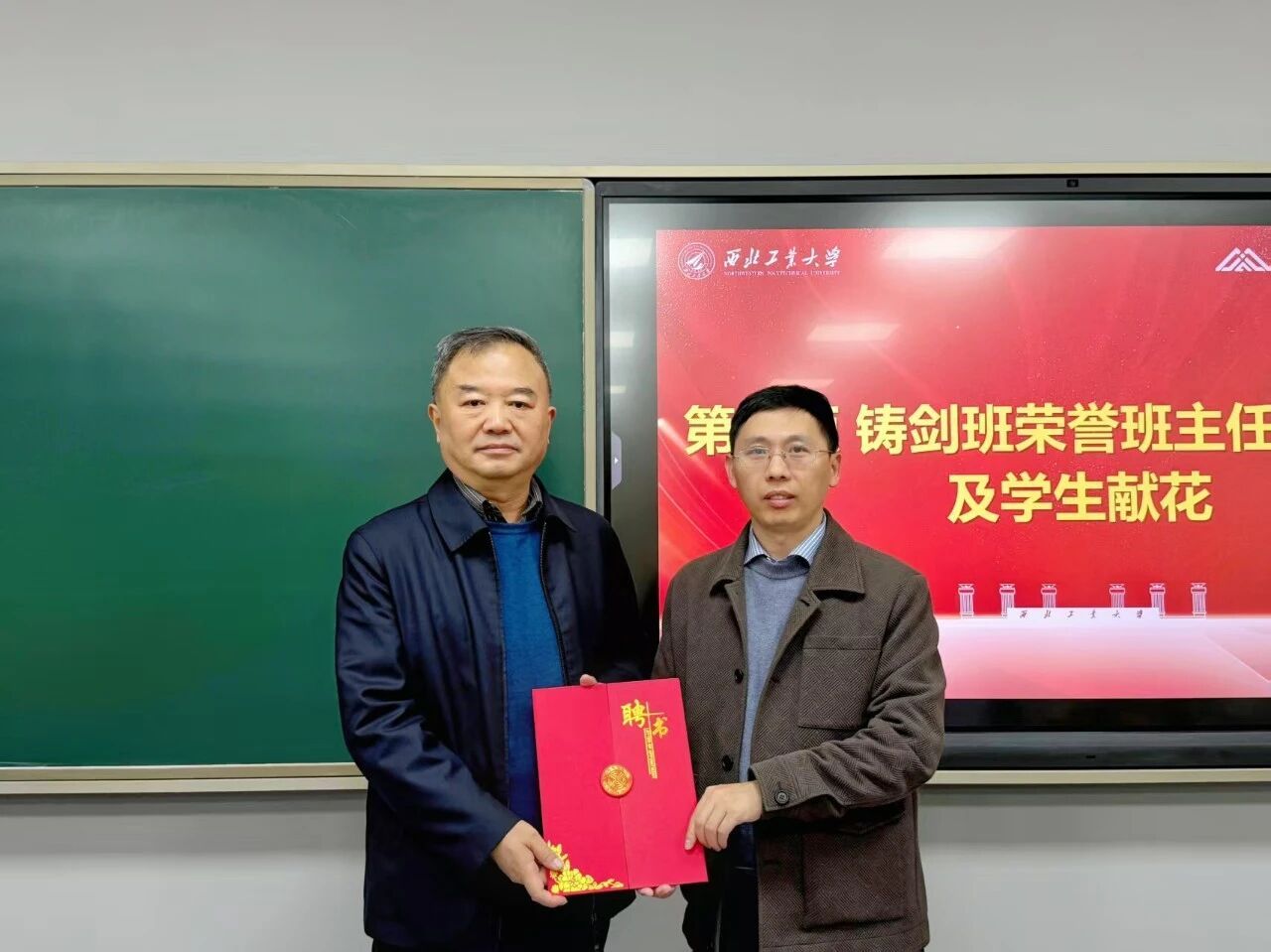 付前刚为李贺军院士颁发第二期铸剑班荣誉班主任聘书,新学员代表向院士献花。