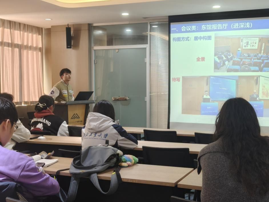 在活动摄影培训中,胡旭从公众号推送的用图需求出发,讲解了各类活动的拍摄要领。他介绍了三分法、引导线等经典构图方法,结合推送特点,梳理了不同场景的“必拍”画面清单。除了拍摄技术外,他还着重强调了摄影师的现场把控能力,包括机位选择、画面组织与关键时刻捕捉等,帮助同学们为公众号推送积累高质量的图片素材。
